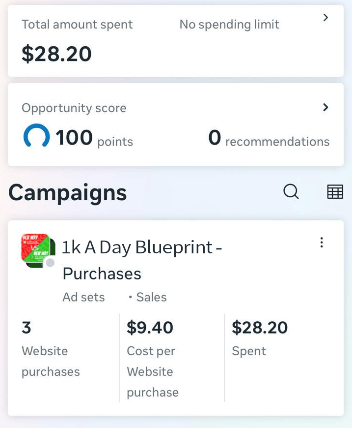 When he put it all into a blueprint I was one of the first to test it. Followed the steps, launched my ads, and got 3 purchases at $9.40 each on my very first campaign. If you're on the fence — don't be.